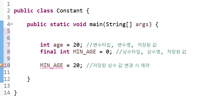 상수를 선언할때는 변수와 똑같은 방법으로 선언하지만 변수 타입 앞에 final을, 변수명을 모두 대문자로 작성해야 한다.