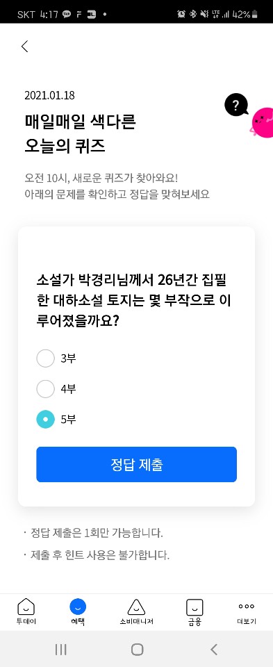 오늘의 퀴즈 문제 : 소설사 박경리 님께서 26년간 집필한 대하소설 토지는 몇 부작으로 이루어졌을까요?