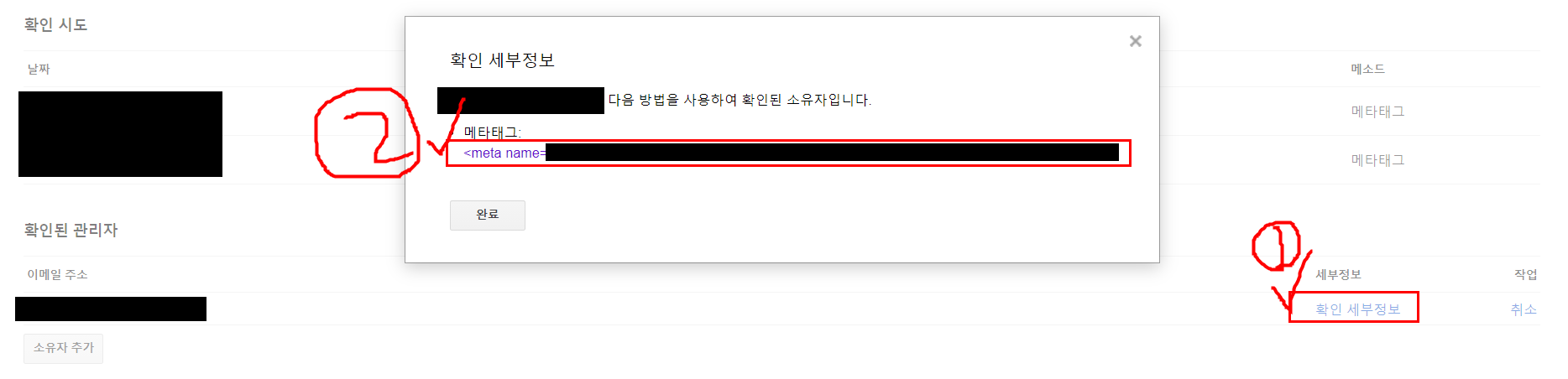 아래쪽 확인된 관리자에서 오른쪽 확인 세부 정보 클릭 후 메타태그 복사하기