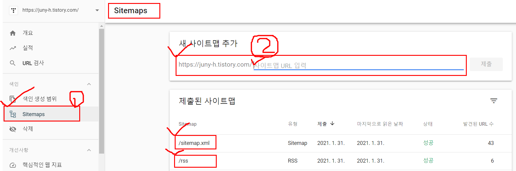 3. '제출된 사이트맵'에 /rss와 /sitemap.xml 두 가지가 만들어졌다면 성공
