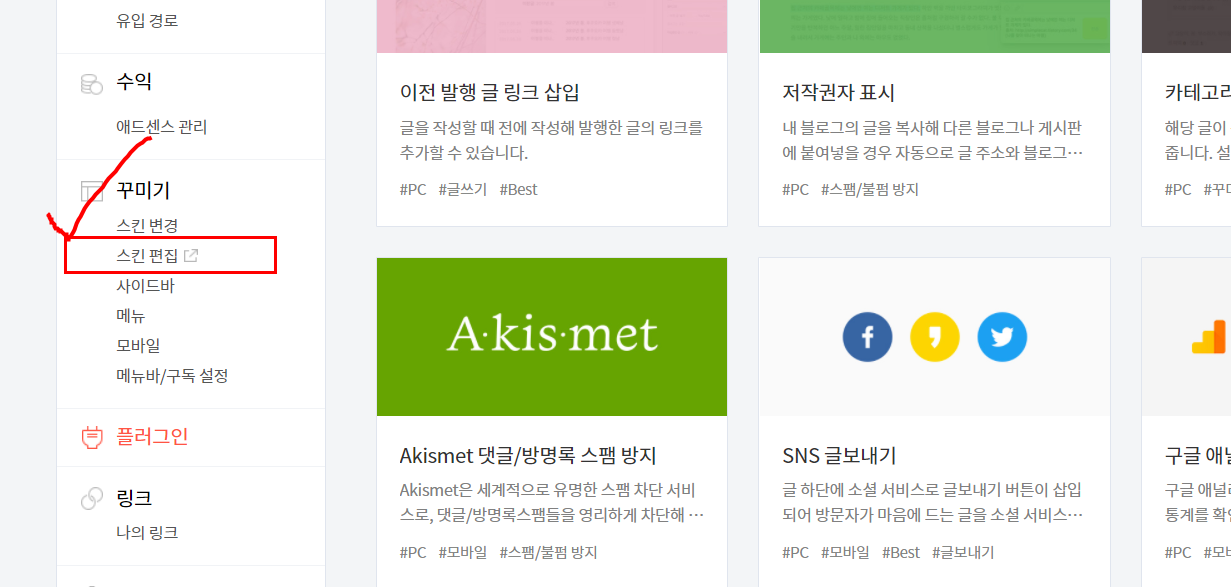 티스토리 화면으로 돌아가 꾸미기 탭에 있는 스킨 편집 클릭