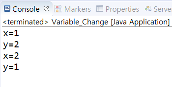x의 값을 y에 저장하고, y의 값을 x에 저장할 경우 변경된 리터럴이 저장되므로 원하는 결과를 얻을 수 없다.