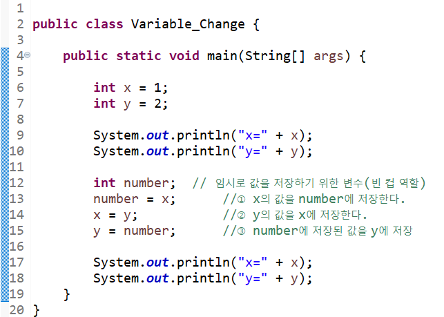 그렇기에 두 컵에 담긴 내용물을 바꾸려면 빈 컵이 필요한 것처럼, 값을 임시로 저장할 변수가 하나 더 필요하다.