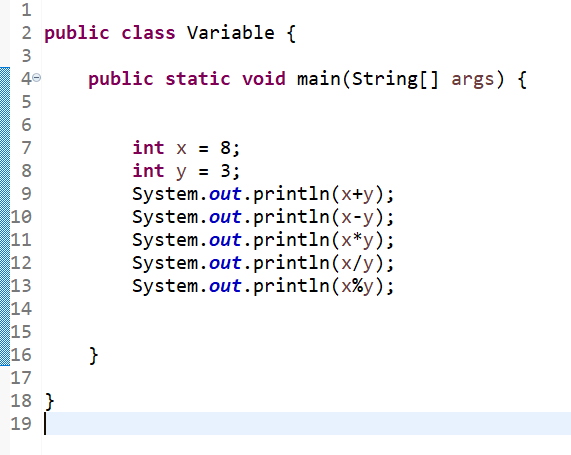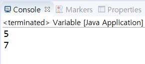 14번째 줄 System.out.println(x); 는 x를 화면에 출력하라는 명령이며, 기존의 값인 5는 지워지고 7로 변경되어 결과 화면에도 7이 출력된 것을 볼 수 있다.